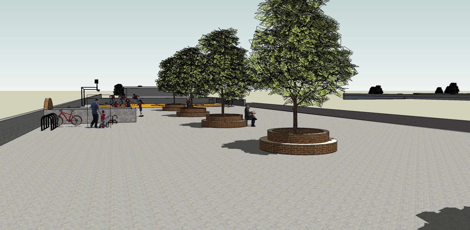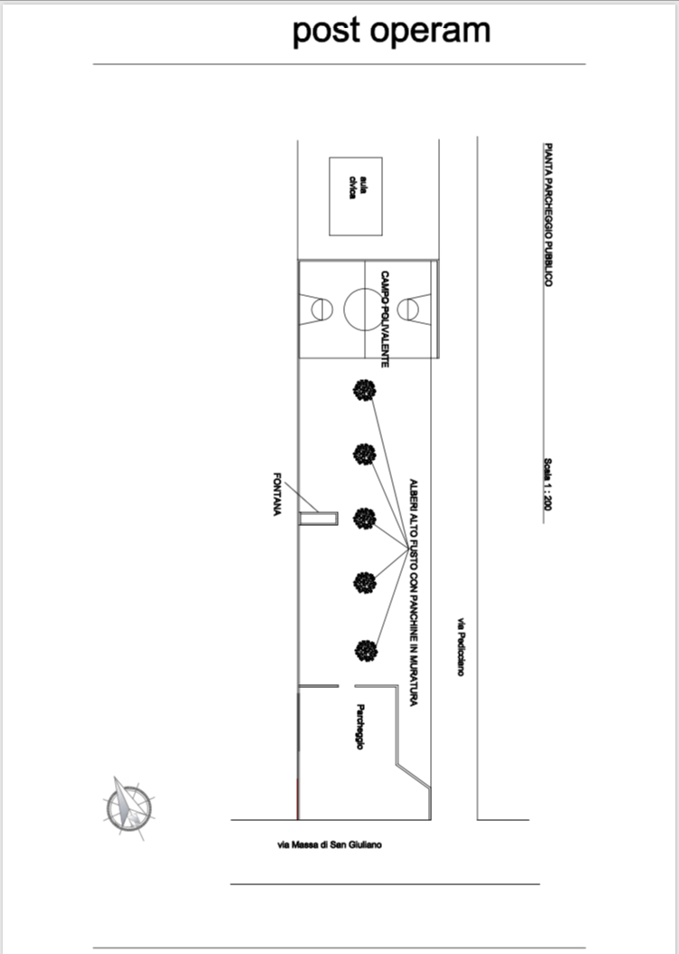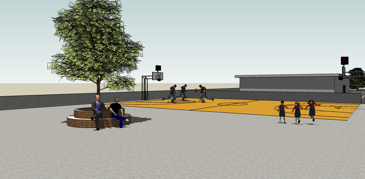Dalla figura sottostante si può notare come la sistemazione di numero 5 alberi di alto fusto al suo centro darà la possibilità di avere del verde e anche ombra per i periodi più caldi. Intorno agli alberi saranno posizionate delle panchine e nella parte finale della piazza un campo da basket (disegnato sulla pavimentazione già esistente) per i ragazzi.